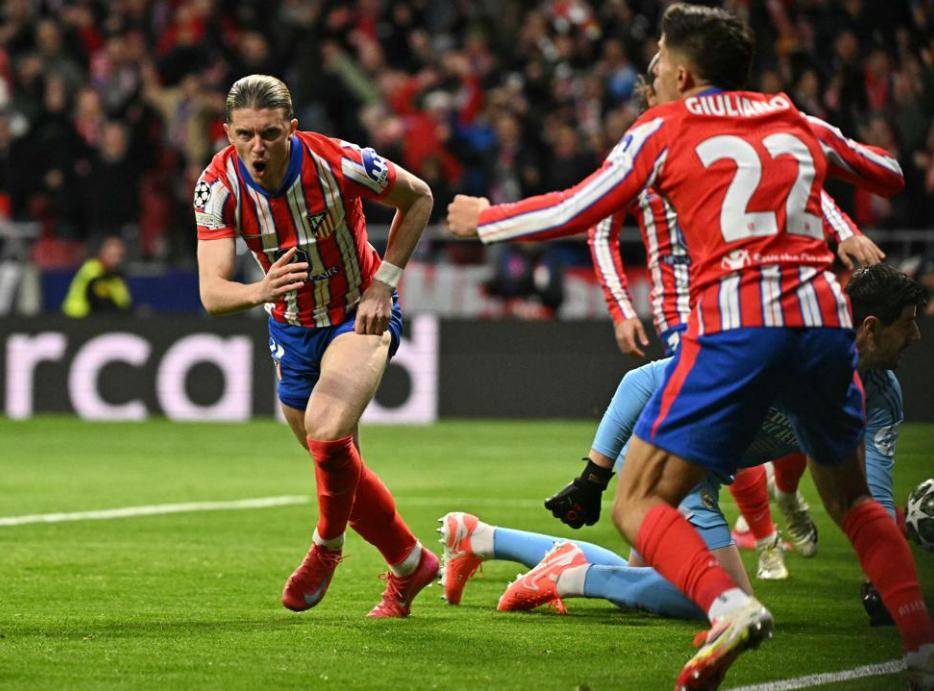 比赛刚一开始,万达大都会球场的气氛就弥漫着紧张与期待,超过七万名主场球迷的呐喊声掀起了波涛。谁也未曾预料到,在比赛仅仅开始27秒时,球场爆发出震耳欲聋的欢呼。马竞的阿尔瓦雷斯从中场带球,迅速将球传给德保罗,后者迅速突破到禁区右侧并送出精准传中,刚刚进入禁区的加拉格尔毫不犹豫推射,皮球如炮弹般飞入球网,为马竞打破僵局,1-0领先,并将总比分扳为1-1。